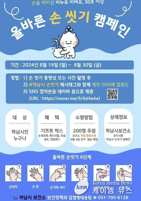 (케이엠뉴스) 하남시는 여름철 유행하는 감염병 예방을 위해 이달 19일부터 30일까지 손을 씻는 영상 또는 사진을 개인 SNS에 올려 인증하면 상품을 증정하는 손 씻기 캠페인을 실시한다고 밝혔다.