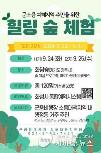 (케이엠뉴스) 화성시가 다음달 24일부터 25일까지 이틀에 걸쳐 군소음 피해지역 주민의 스트레스 해소를 위한 주민지원사업으로 마음 치유 힐링 숲 체험 프로그램을 운영한다.