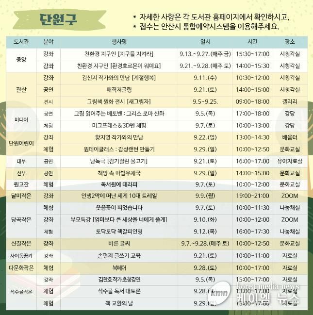 (케이엠뉴스) 안산시는 9월 독서의 달을 맞아 시민의 독서 활동 활성화를 위해 관내 도서관에서 다채로운 문화행사를 운영할 계획이라고 29일 밝혔다.