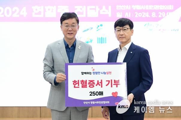 (케이엠뉴스) 안산시 청렴사회민관협의회는 지난 29일 시청 제1회의실에서 안산고려대학병원에 헌혈증 250매를 기부하는 자리를 마련했다고 30일 밝혔다.
