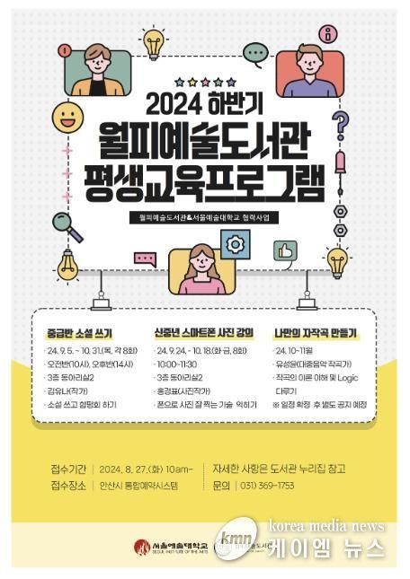 안산시 월피예술도서관은 오는 9월부터 서울예술대학교와 협력해 ‘지역사회와 함께하는 예술인문학’ 특별 강연과 ‘하반기 평생교육 프로그램’을 각각 운영한다고 30일 밝혔다.