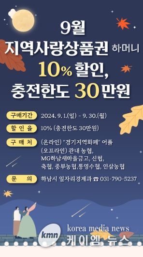 (케이엠뉴스) 하남시가 9월 추석 명절을 맞이하여 지역사랑상품권인 하머니 인센티브를 확대한다고 밝혔다.