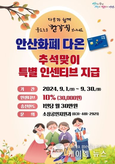 (케이엠뉴스) 안산시는 추석 명절을 맞아 9월 한 달 동안 안산 지역화폐 다온의 ‘특별 인센티브’를 지급한다고 31일 밝혔다.