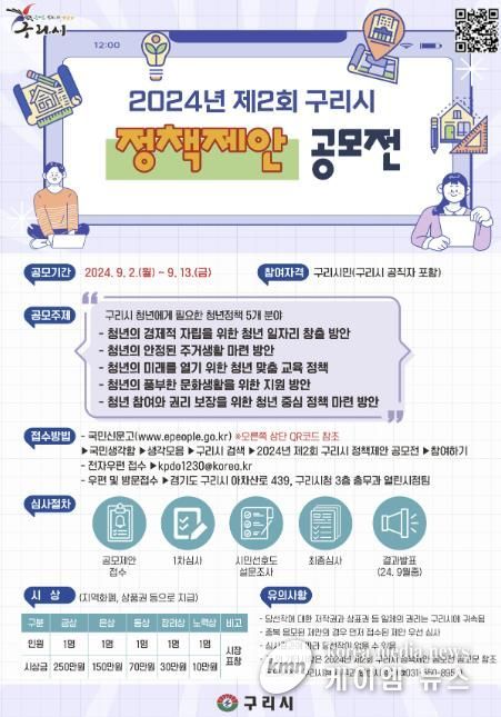 (케이엠뉴스) 구리시가 시민 주도의 창의적인 정책 아이디어를 발굴하고자 9월 2일부터 13일까지‘2024년 제2회 구리시 정책 제안 공모전’을 개최한다.
