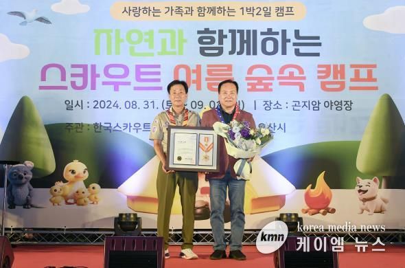 (케이엠뉴스) 오산시는 지난 31일 한국스카우트연맹 곤지암야영장에서 열린 자연과 함께하는 스카우트 여름 숲속캠프에서 이권재 시장이 한국스카우트연맹에서 수여하는 최고 훈장인 무궁화금장을 수상했다고 밝혔다.
