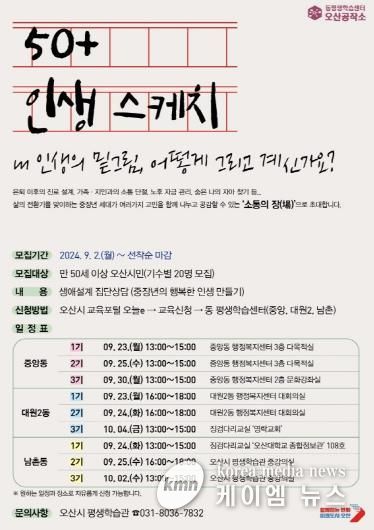 (케이엠뉴스) 오산시는 만 50세 이상 오산시민을 대상으로 생애설계상담 과정인 ‘50+ 인생스케치’를 운영하고 이달 2일부터 신청받는다고 밝혔다.
