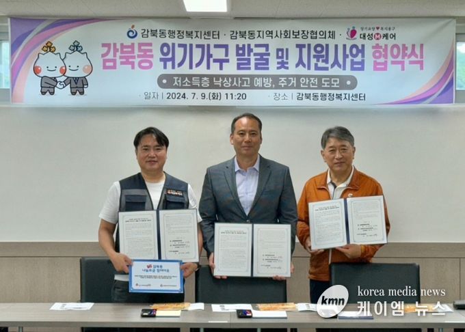 (케이엠뉴스) 지난 7월 9일 하남시 감북동 행정복지센터·감북동 지역사회보장협의체는 감북동 관내 장기요양기관 대성엠케어(대표 조병돈)와 위기가구 발굴 및 지원을 위한 업무협약을 체결했다.