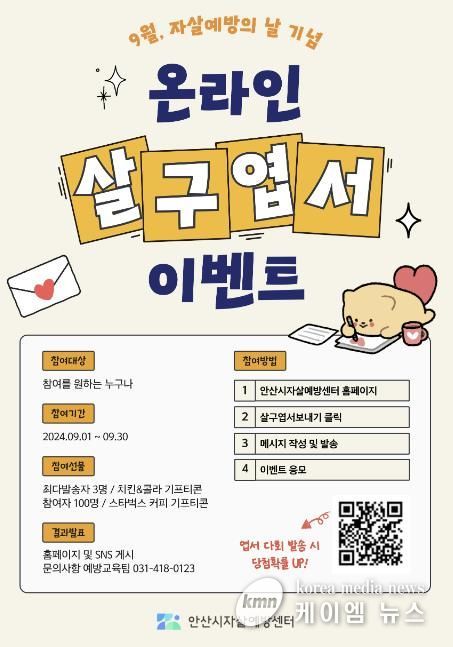 (케이엠뉴스) 안산시 자살예방센터는 9월 한 달간 자살 예방 캠페인과 온라인 살구엽서 이벤트를 진행한다고 4일 밝혔다.