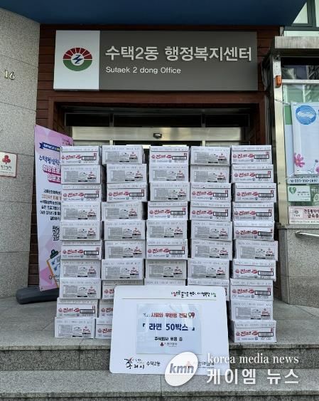 (케이엠뉴스) 구리시 수택2동행정복지센터는 3일 럭키24시마트(주식회사 푸름)에서 신라면(20입) 50박스를 후원받았다고 밝혔다.