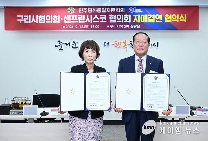 (케이엠뉴스) 구리시는 9월 12일 구리시청 3층 상황실에서 백경현 구리시장을 비롯한 민주평통 자문위원 등 60명이 참석한 가운데 민주평화통일자문회의 구리시협의회와 샌프란시스코협의회가 자매결연식을 가졌다고 전했다.