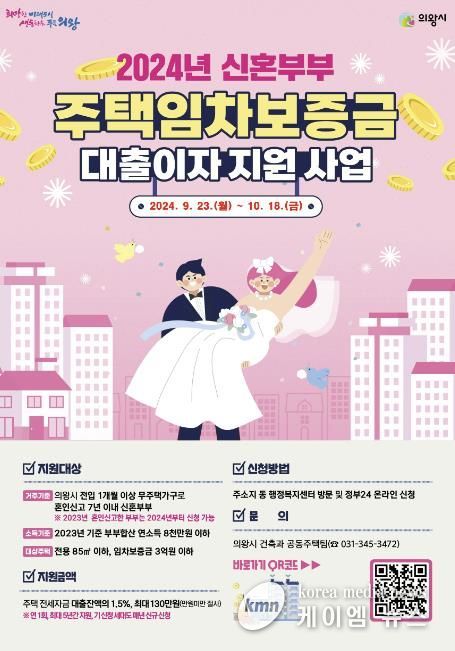(케이엠뉴스) 의왕시가 무주택 신혼부부의 자립기반 마련 및 주거안정 도모를 위해 주택임차보증금 대출이자 지원 대상자를 9월 23일부터 10월 18일까지 모집한다고 밝혔다.