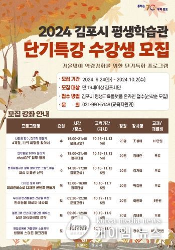 모집기간은 오는 9월 24일부터 10월 2일까지이며, 수강생은 전 과목 선착순으로 선발한다. 수강신청은 김포시 평생교육 플랫폼을 통해서 접수 가능하다.