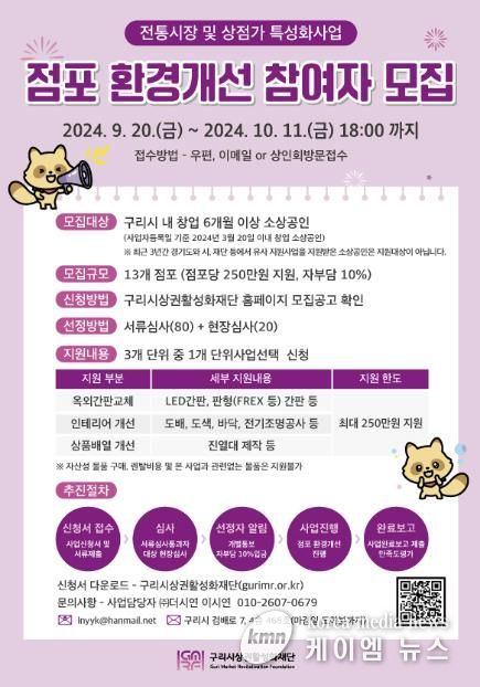 (케이엠뉴스) 구리시상권활성화재단은 9월 20일부터 구리시 소상공인들을 대상으로 경영 안정화와 경쟁력 강화를 위해 점포 환경개선 지원 사업 참여자를 모집한다고 밝혔다.