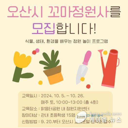 (케이엠뉴스) 오산시는 ‘2024년 공공형 마을정원 정원문화프로그램’의 일환으로 오산 꼬마정원사 프로그램 참여자를 이달 20일부터 선착순 모집하고 있다.