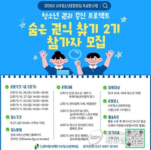 (케이엠뉴스) (재)김포시청소년재단 사우청소년문화의집은 청소년의 권익증진을 위한 ‘숨은 권익 찾기’ 2기 프로그램에 참여할 청소년을 모집한다. 10월 26일부터 11월 9일까지 총 5회기 동안 관내 14세~19세 청소년 15명을 대상으로 운영된다.