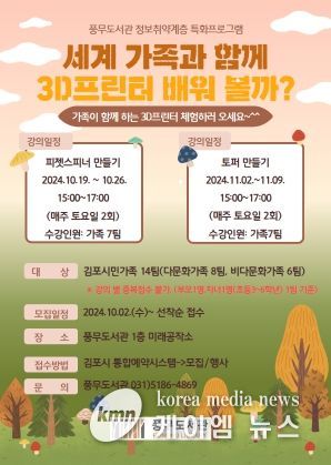 (케이엠뉴스) 김포시 풍무도서관은 정보취약계층 특화 프로그램 ‘세계 가족과 함께 3D프린터 배워 볼까?’를 오는 10월 19일부터 11월 9일까지 매주 수요일 오후 3시에 풍무도서관 미래공작소에서 운영한다고 밝혔다.