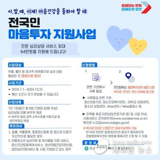 (케이엠뉴스) 오산시는 전국민 마음투자 지원사업의 접근성을 높이기 위하여 2일부터 온라인으로도 서비스 신청이 가능하다고 밝혔다.