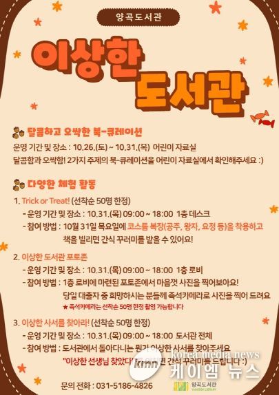 (케이엠뉴스) 김포시 양곡도서관은 10월 31일 목요일, ‘이상한 도서관’을 운영한다. 이는 시민들이 쉽게 찾고 즐길 수 있는 도서관을 만들기 위한 행사로 ▲달콤, 오싹을 주제로한 북큐레이션 ▲체험 활동 3종(이상한 도서관 포토존 , 이상한 사서를 찾아라 등) ▲독서문화 프로그램(불 꺼진 양곡도서관) 등 총 3개 분야 5개 프로그램으로 구성된다.