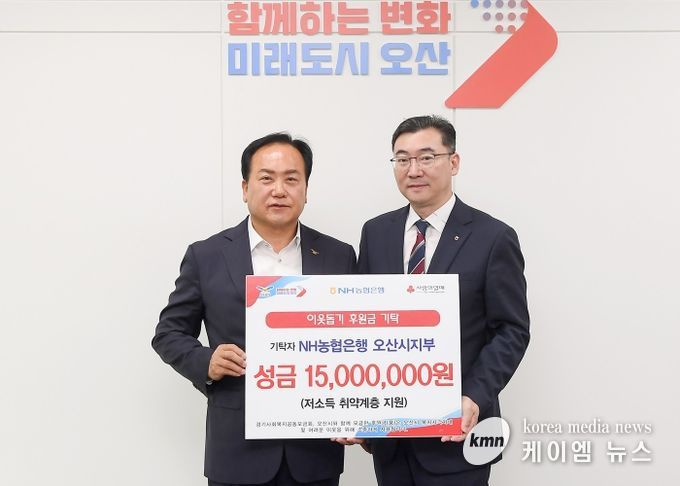 (케이엠뉴스) 오산시는 8일 오산시청 집무실에서 NH농협은행 오산시지부에서 지역 내 저소득 취약계층을 위한 성금 1,500만 원을 기탁받았다.