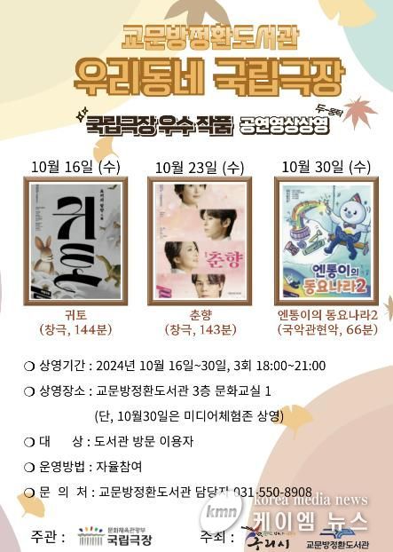 (케이엠뉴스) 구리시 교문방정환도서관은 오는 10월 16일부터 ‘2024년 우리동네 국립극장’ 프로그램을 매주 수요일마다 세 차례에 걸쳐 운영한다고 밝혔다.