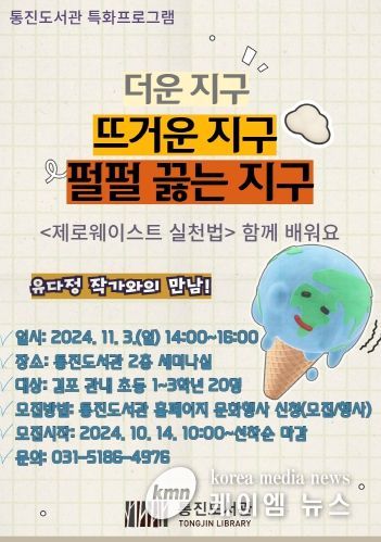 (케이엠뉴스) 김포시 통진도서관은 11월 3일 일요일 오후 2시부터 4시까지 통진도서관 2층 세미나실에서 유다정 작가를 초청해 작가와의 만남 ‘더운 지구 뜨거운 지구 펄펄 끓는 지구’를 운영한다.