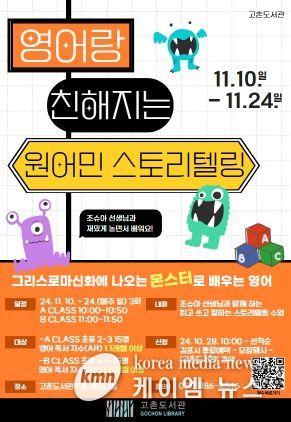 (케이엠뉴스) 김포시 고촌도서관은 오는 11월 10일부터 11월 24일까지 특화프로그램 ‘영어랑 친해지는 원어민 스토리텔링’을 총 3차례에 걸쳐 운영한다고 밝혔다.