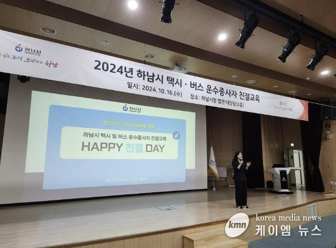 (케이엠뉴스) 하남시는 지난 16일 시청 별관 2층 대강당에서 관내 택시 및 버스 운수종사자 250여 명을 대상으로 ‘2024년 택시·버스 운수종사자 친절교육’을 실시했다고 밝혔다.