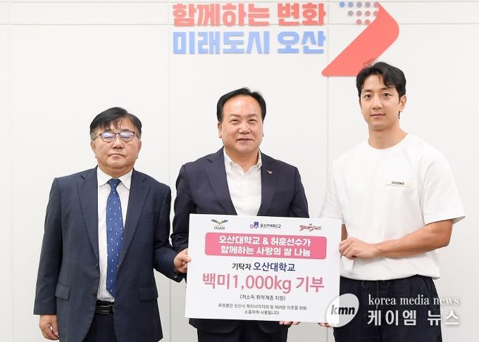 (케이엠뉴스) 오산시는 16일 오산시청에서 오산대학교와 수원KT소닉붐 허훈 선수와 함께하는 3점 슛 기부챌린지로 적립한 금액 3백만 원(백미 10kg 100포)을 취약계층을 위해 기탁했다.