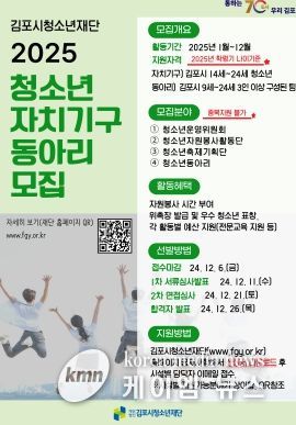 (케이엠뉴스) 김포시청소년재단에서 2025년 청소년 수련시설을 함께 이끌어 갈 청소년자치기구 및 동아리 참여자를 오는 10월 29일부터 12월 6일까지 모집한다.