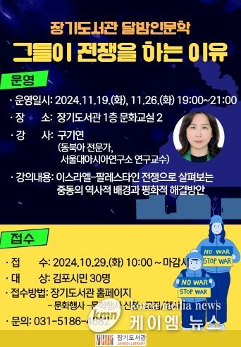(케이엠뉴스) 김포시 장기도서관에서는 오는 11월 19일과 26일 저녁 7시부터 달밤인문학 ‘그들이 전쟁을 하는 이유’를 운영한다.