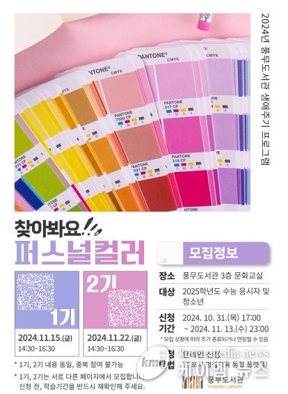 (케이엠뉴스) 김포시 풍무도서관에서 2024년 생애주기별 프로그램의 일환으로 고등학생 대상 프로그램인 ‘찾아봐요 퍼스널컬러’를 오는 11월 15일, 22일 14시 30분부터 16시 30분까지 2회 운영한다고 밝혔다.