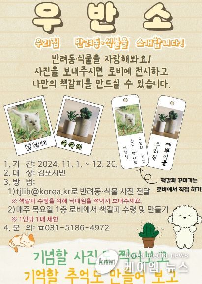 (케이엠뉴스) 김포시 통진도서관은 오는 11월 1일부터 시민이 참여하는 ‘우 반 소’(우리집 반려동·식물을 소개합니다) 프로그램을 운영한다.