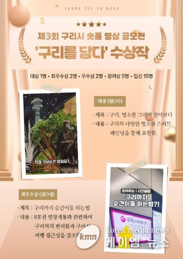 (케이엠뉴스) 구리시는 시민과 소통하는 도시를 표현하고자 개최한 제3회 구리시 숏폼 영상 공모전‘구리를 담다’ 의 수상작 25편을 선정해 발표했다.