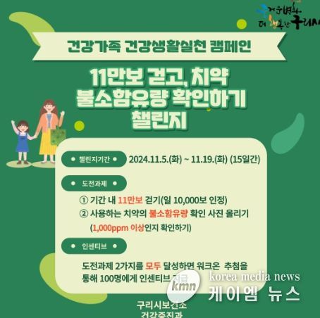 (케이엠뉴스) 구리시는 4일 “11월 맞이 건강가족 건강생활실천 챌린지로 ‘11만보 걷고, 치약 불소 함유량 확인하기’를 운영한다고 전했다.