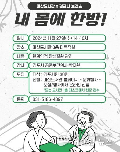 ‘내 몸에 한방’ 참여 신청은 2024년 11월 6일 10시부터 마산도서관 홈페이지 ‘문화행사 신청’에서 선착순 온라인 접수로 진행하며 모집 대상은 김포시민 30명이다.