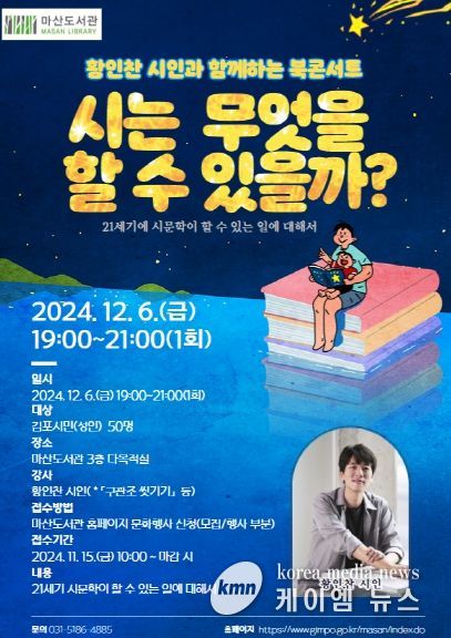 (케이엠뉴스) 김포시 마산도서관은 오는 12월 6일 19시부터 21시까지 마산도서관 3층 다목적실에서 시인 황인찬과 함께하는 북콘서트 ‘시는 무엇을 할 수 있을까?’를 운영한다.