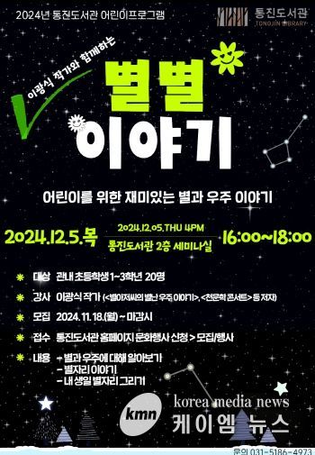 (케이엠뉴스) 김포시 통진도서관은 2024년 어린이 프로그램 ‘별별 이야기’를 오는 12월 5일 목요일 16시에서 18시까지 통진도서관 2층 세미나실에서 운영한다.