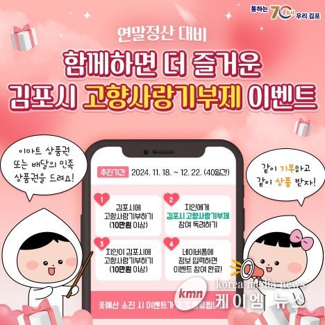 (케이엠뉴스) 김포시는 연말정산을 대비하여 고향사랑기부제 홍보와 기부금 모금액 확대를 위해 11월 18일부터 12월 22일까지 '함께하면 더 즐거운 김포시 고향사랑기부제 이벤트'를 진행한다고 밝혔다.