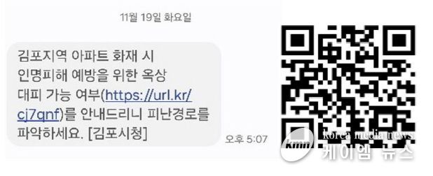 재난문자를 받은 한 김포시민은 “그동안 아파트 화재 시 고층 거주자는 무조건 옥상으로 대피하는 것으로 알고 있었는데 새로운 정보를 알게 됐다”며 “재난문자를 통해 내가 거주하는 아파트의 피난경로를 다시 파악하게 되는 계기가 됐다”고 말했다.