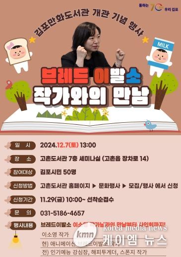 (케이엠뉴스) 김포만화도서관 개관을 기념하여 김포시 고촌도서관에서는 만화 '브레드이발소 작가와의 만남' 강의를 12월 7일 오후 1시부터 2시까지 7층 세미나실에서 진행한다. 해당 강연은 김포시민 50명을 대상으로 한다.