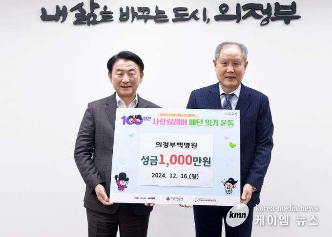 (케이엠뉴스) 의정부시는 12월 16일 의료법인 영동의료재단 의정부백병원이 ‘100일간 사랑릴레이 배턴 잇기’ 창구에 성금 1천만 원을 기탁했다고 밝혔다.