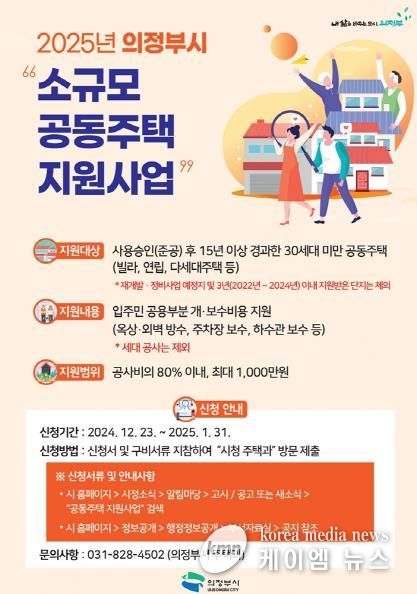 (케이엠뉴스) 의정부시는 노후 공동주택의 관리비용 부담 완화와 주거 환경 개선을 위해 내년 1월 31일까지 ‘2025년 공동주택 지원사업’ 신청을 받는다.