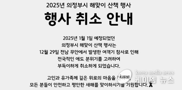 (케이엠뉴스) 의정부시는 전남 무안공항에서 발생한 여객기 참사와 관련해 국가 애도기간을 고려하여, 2025년 1월 1일 을사년 새해를 맞아 시민과 함께 건강하게 새해 새 아침을 걷기 위해 추진하던 2025년 새해 해맞이 걷기 행사를 부득이하게 전면 취소한다고 30일 밝혔다.