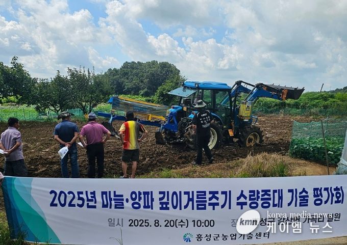 (케이엠뉴스) 홍성군농업기술센터(소장 이승복)는 지난 20일 갈산면 가곡리 시범포장에서 ‘마늘·양파 깊이거름주기 수량증대 기술 평가회 및 시연회’를 성황리에 개최했다.