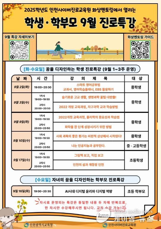 (케이엠뉴스) 인천광역시교육청은 9월 2일부터 9월 17일까지 인천사이버진로교육원 온라인 화상 시스템을 통해 ‘학생·학부모 9월 진로특강’을 운영한다고 밝혔다.