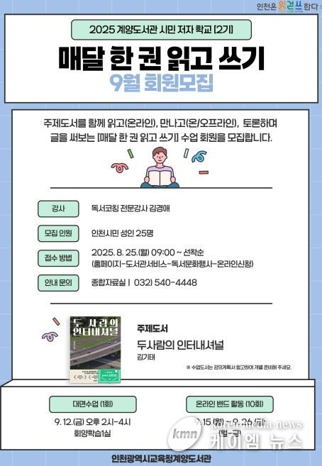 (케이엠뉴스) 인천광역시교육청계양도서관은 인천시민을 대상으로 9월 12일부터 26일까지 시민저자학교 2기 ‘매달 한 권 읽고 쓰기’ 프로그램을 운영한다.