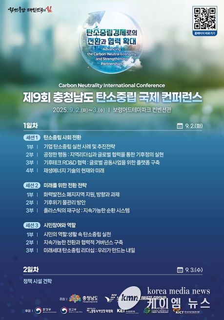 (케이엠뉴스) 충남도는 9월 2-3일 보령 머드테마파크 컨벤션관에서 ‘제9회 충청남도 탄소중립 국제 콘퍼런스’를 개최한다고 26일 밝혔다.