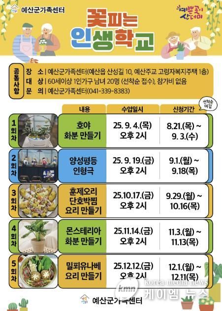 (케이엠뉴스) 예산군가족센터는 예산군노인종합복지관, 예산군고령자복지주택 주거행복지원센터와 협력해 관내 60세 이상 1인가구 및 지역민을 대상으로 ‘꽃피는 인생학교’를 오는 9월부터 12월까지 운영한다.