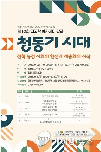 (케이엠뉴스) 인천광역시 검단선사박물관은 9월 22일부터 10월 20일까지 성인을 대상으로 제10회 선사시대(고고학) 아카데미 ‘청동기 시대 – 정착 농경 사회의 형성과 계층화의 시작’을 운영한다고 밝혔다.