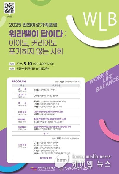 (케이엠뉴스) 인천여성가족재단은 오는 9월 10일, 인구보건복지협회 인천지회와 공동으로 '2025 인천여성가족포럼'을 개최한다고 밝혔다.